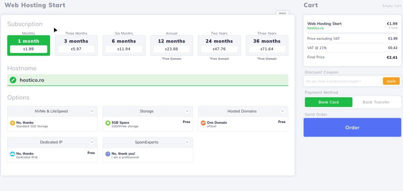 All shared hosting packages in the offer can be configured with the new LiteSpeed + NVMe option. All you have to do is add the desired service to the cart and select the corresponding option during setup.