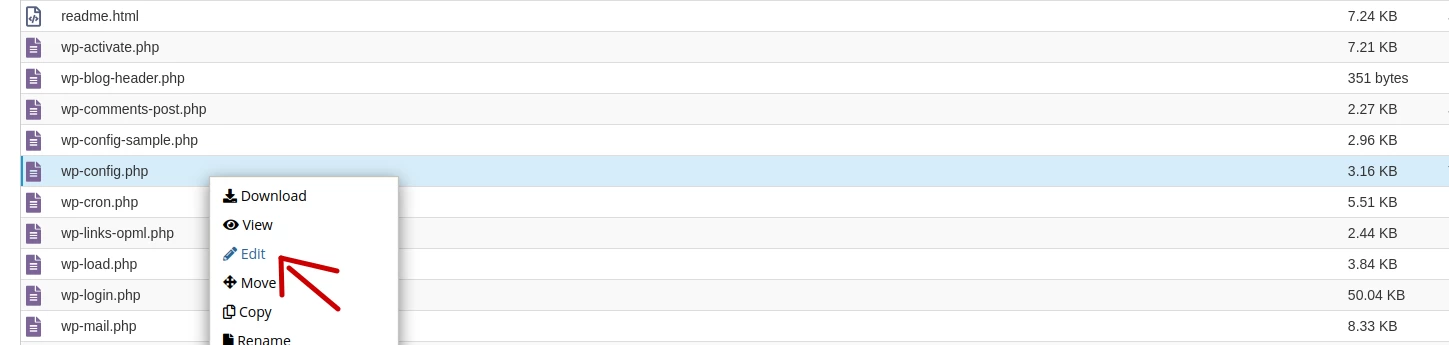 ◦ Then we search for the public_html folder and edit the wp-config.php file by right-clicking on it.