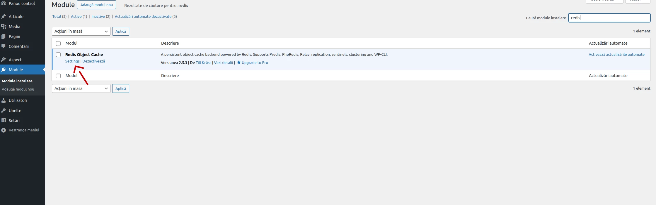 ◦ We search for the Redis Object plugin and access its settings by clicking on Settings.