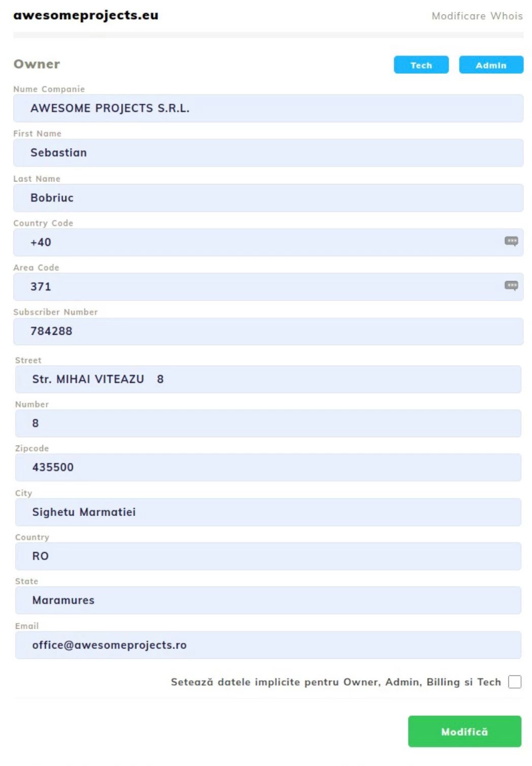 - Changing the registrant data at the domain level will not automatically lead to updating the billing data. To change the billing, you will need to follow the steps in the corresponding tutorial: Changing the pro forma invoice;