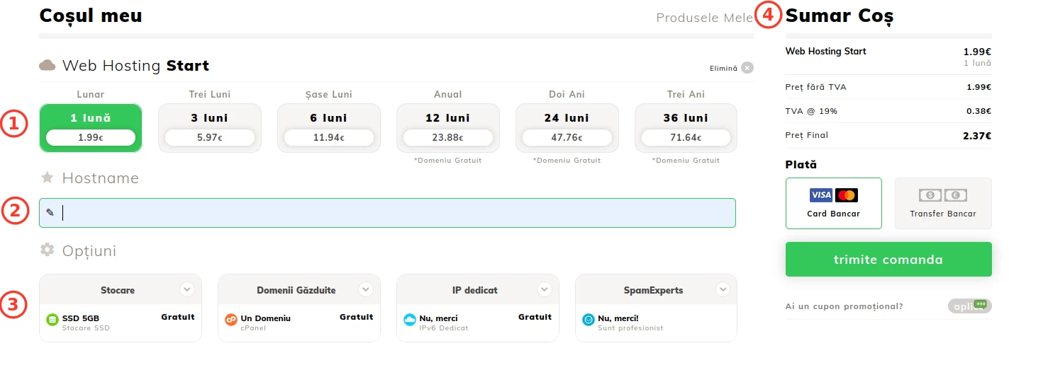 Important! When purchasing a hosting package with a minimum billing period of one year, the free registration or transfer of a domain from the following extensions is included in the offer: .ro, .eu, .com, .net, .org, .info, .biz, .us, .co.uk. The domain is registered/transferred free of charge only in the first billing year; thereafter, the applicable fee for each extension will apply.