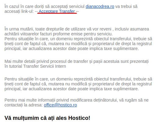 The beneficiary will receive an email at the Hostico customer account address requesting Acceptance of the transfer.