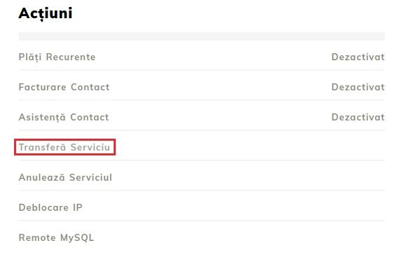 - The transfer of a service cannot be performed if there is a proforma invoice generated in the customer account or if the service to be transferred does not have an Active status. If you wish to transfer such a service, please contact the sales department.
