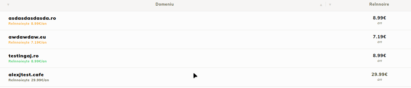• Your domains registered with Hostico are displayed. You can see the name, status, remaining active period, and renewal cost.